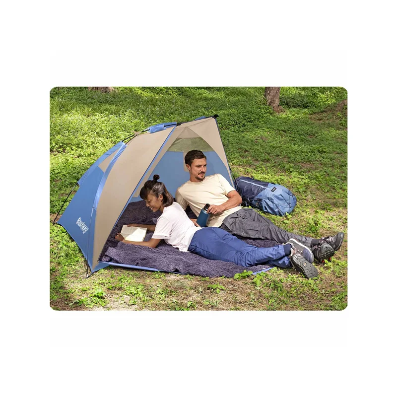 چادر مسافرتی 2 نفره تابستانی بست وی از سری چادر های مسافرتی مدل جدید شرکتبست وی می باشد که برخلاف سایر چادر ها ، طراحی آن متفاوت است . این چادر در واقع می تواند سایه بانی باشد که در فصل گرما بتوانید در یک شرایط ایده آل تری استراحت کرده و از طبیعت و دیدن مناظر لذت ببرید . داشتن درب بزرگ در این چادر باعث شده است تا گردش هوا بهتر شود و با تهویه های بهتر در روز های تابستانی زیر سایه چادر ریلکس کنید . ابعاد چادر مسافرتی تابستانی بست وی به نحوی است که دو فرد بزرگسال به راحتی می توانند در کنار یکدیگر دراز کشیده و استراحت کنند ، به طوریکه اصلا کمبود فضایی را احساس نکنند . راه اندازی و نصب چادر نیز بسیار آسان بوده و در کمترین زمان می توانید آن را راه اندازی کرده و مورد استفاده قرار دهید .